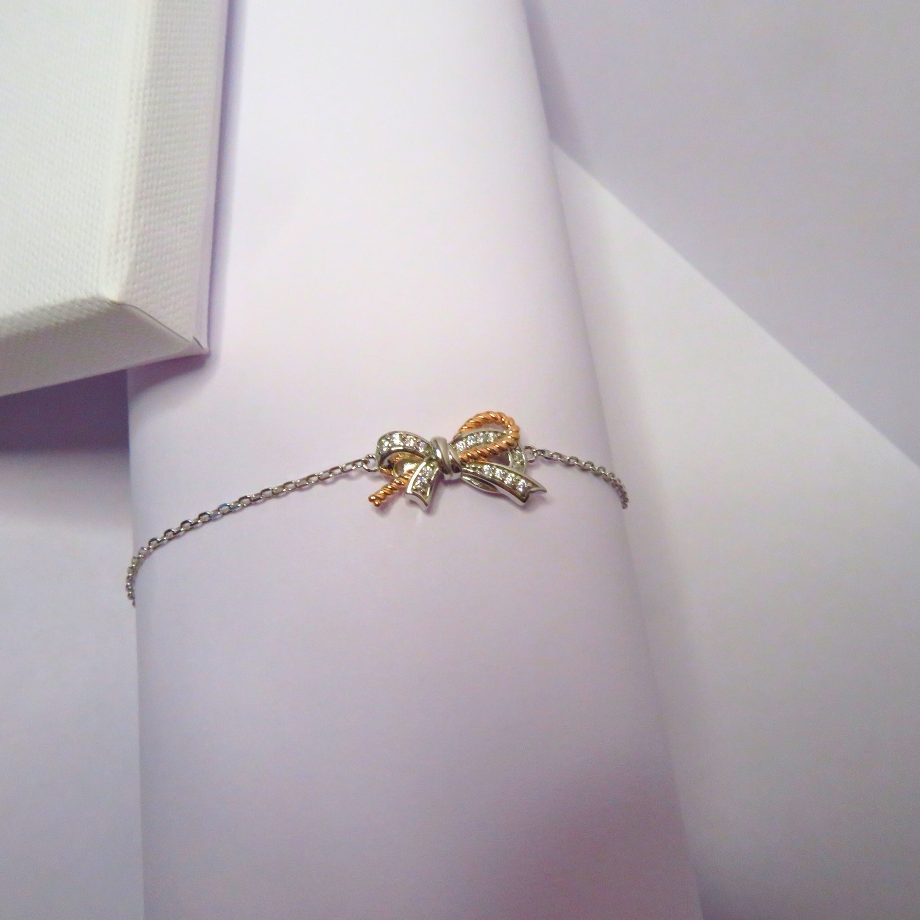 Su lazo de plata 925 con circonitas brilla junto a una cuerda bañada en oro rosado, creando una armonía entre luz y fortaleza.